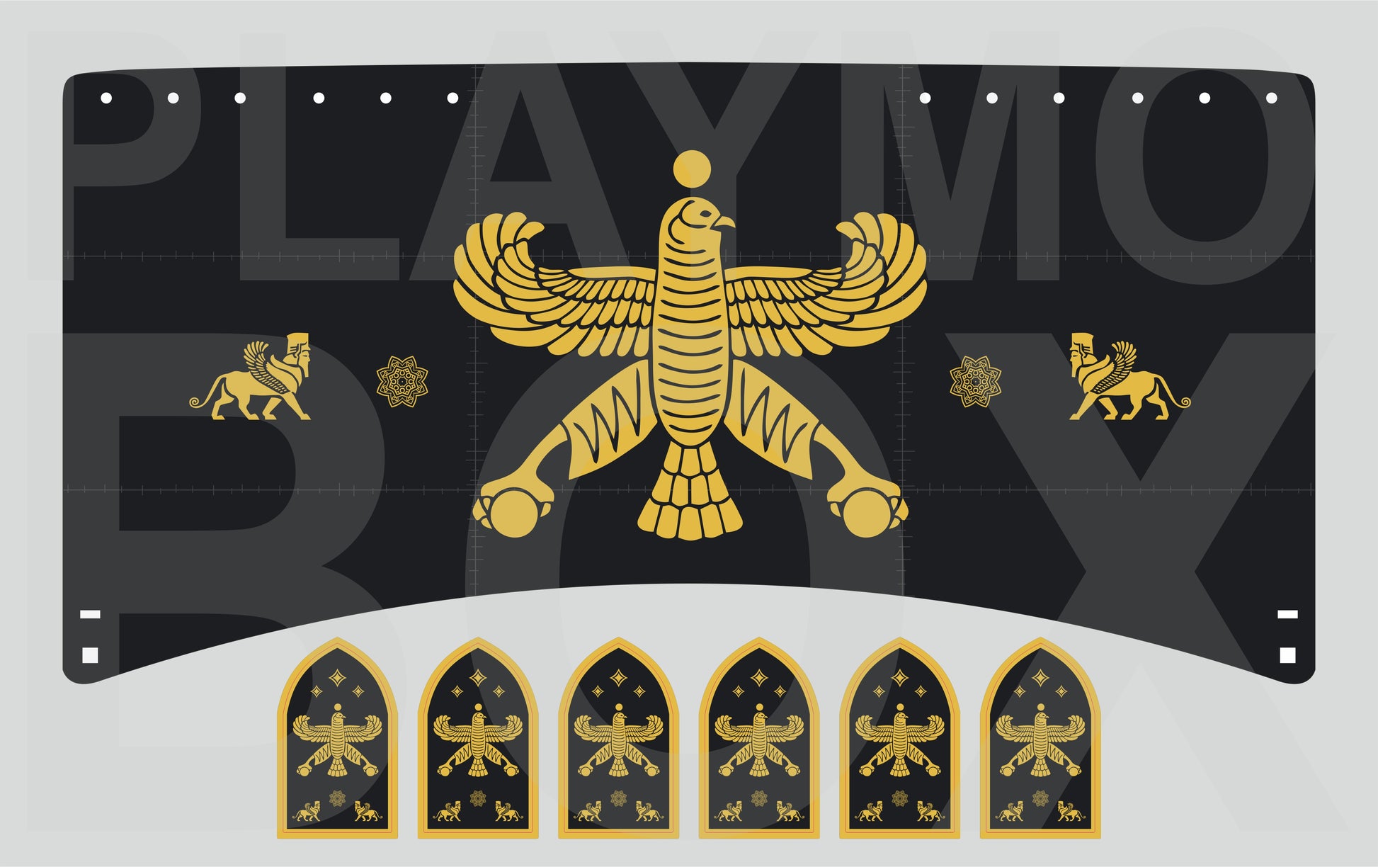 Διέσχισε τα βασιλικά νερά της αυτοκρατορίας υπό την ευλογία του Φαραβαχάρ και τη φλόγα της αιώνιας αλήθειας. Αυτό το premium αδιάβροχο σετ πανιού και αυτοκόλλητων φέρει αχαιμενιδικά και αυτοκρατορικά μοτίβα: φτερωτούς φύλακες, ζωφόρους με άνθη λωτού και παλαμέτες, εμβλήματα λέοντα–ταύρου και το λαμπρό σύμβολο της βασιλικής εξουσίας. Εμπνευσμένο από τις τελετουργικές γαλέρες και τα ταχέα πολεμικά σκάφη του αχαιμενιδικού στόλου, από την Αίγυπτο έως την Ιωνία, το διπλής όψης πανί αποπνέει ταυτόχρονα αυτοκρατορική μεγαλοπρέπεια και θαλάσσια ισχύ. Είτε συνοδεύει φόρους από μακρινές σατραπείες, είτε περιπολεί τις Θάλασσες του Βασιλέως, είτε τιμά το θέλημα του Μεγάλου Βασιλέως, το Playmobil σκάφος σου μεταμορφώνεται σε πλοίο της αυτοκρατορίας — κληρονόμο των Πασαργάδων, των Περσέπολης και της αρχαίας περσικής μεγαλουργίας.