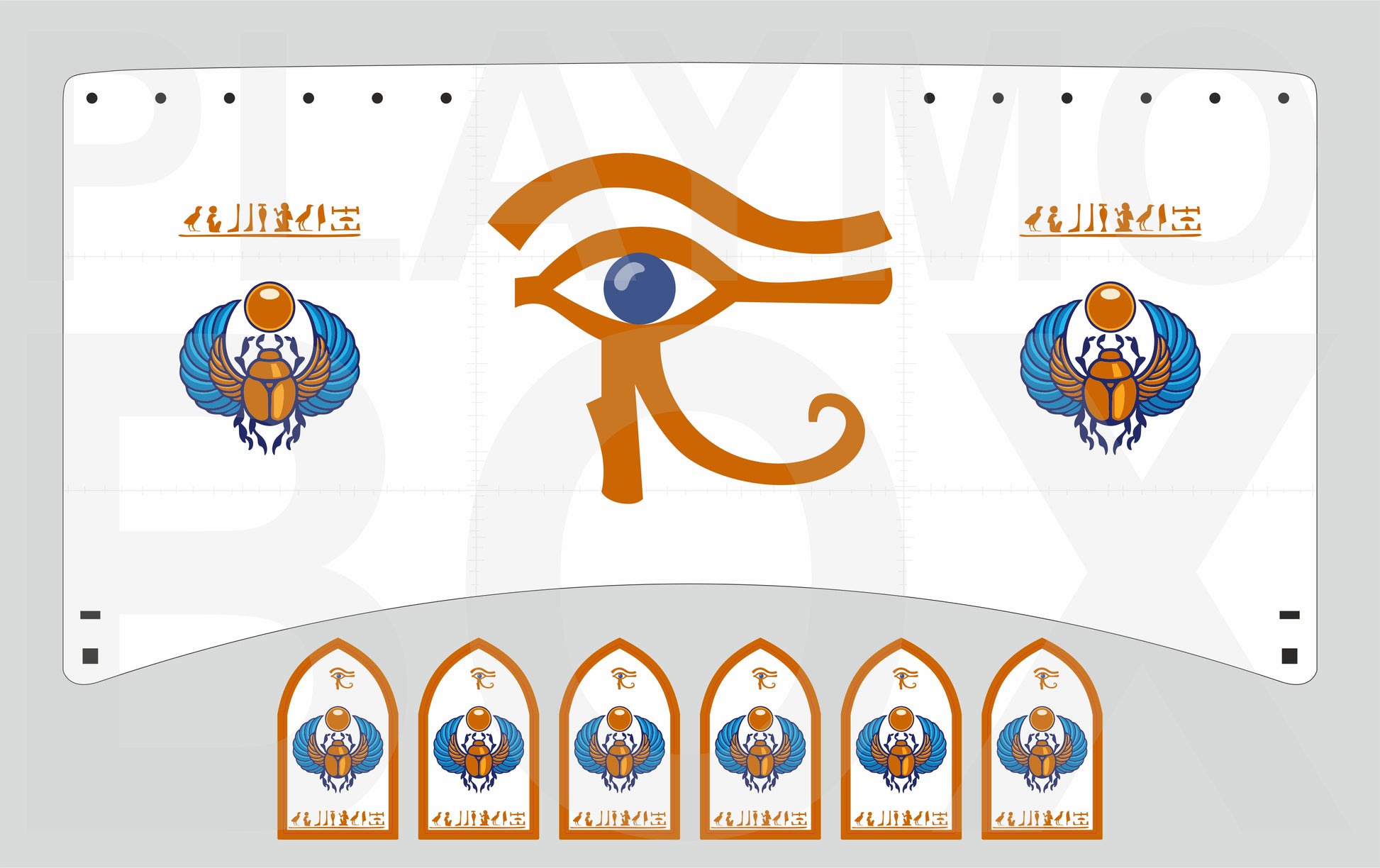 Sail the sacred Nile and foreign seas under the protection of the falcon and the bloom of the lotus. This premium waterproof sail and sticker set features hieroglyphic motifs, the eye of protection, papyrus patterns, and the soaring falcon—emblem of divine kingship and sky power. Inspired by the ceremonial and military vessels of the New Kingdom and Ptolemaic fleets, the double-sided sail evokes both majesty and might. Whether transporting treasure, patrolling foreign harbors, or guarding pharaoh's will, your Playmobil vessel becomes a barge of empire and eternal tradition.