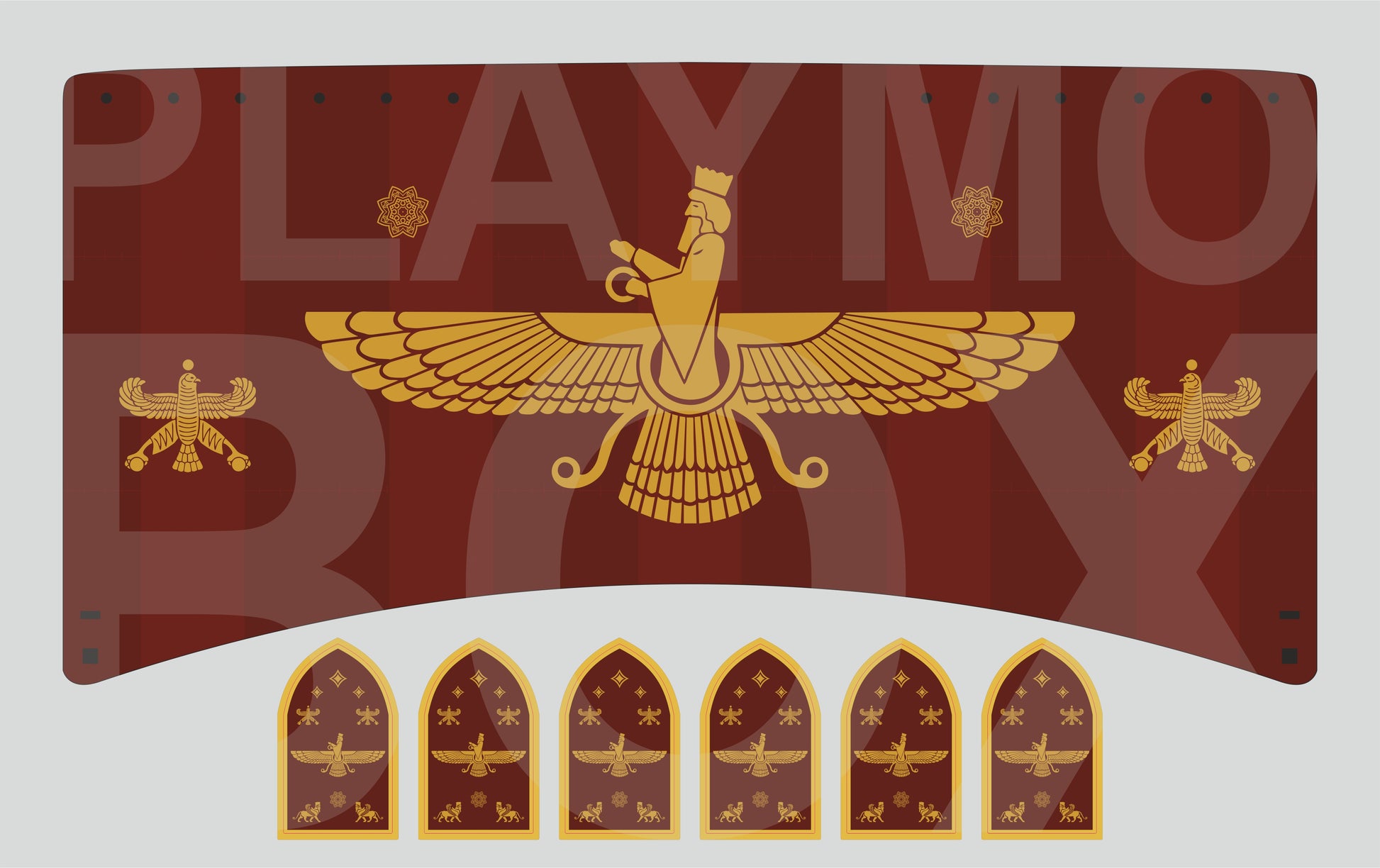 Stride across the royal waters of the empire beneath the blessing of the Faravahar and the flame of eternal truth. This premium waterproof sail and sticker set bears Achaemenid and imperial motifs: winged guardians, lotus-and-palmette friezes, lion-bull emblems, and the radiant symbol of royal authority. Inspired by the ceremonial galleys and swift war-vessels of the Achaemenid fleet from Egypt to Ionia, the double-sided sail captures both imperial dignity and oceanic command. Whether escorting tribute from distant satrapies, patrolling the King’s Seas, or upholding the will of the Great King, your Playmobil vessel becomes a ship of empire—an heir to Persepolis, Pasargadae, and the grandeur of ancient Persia.